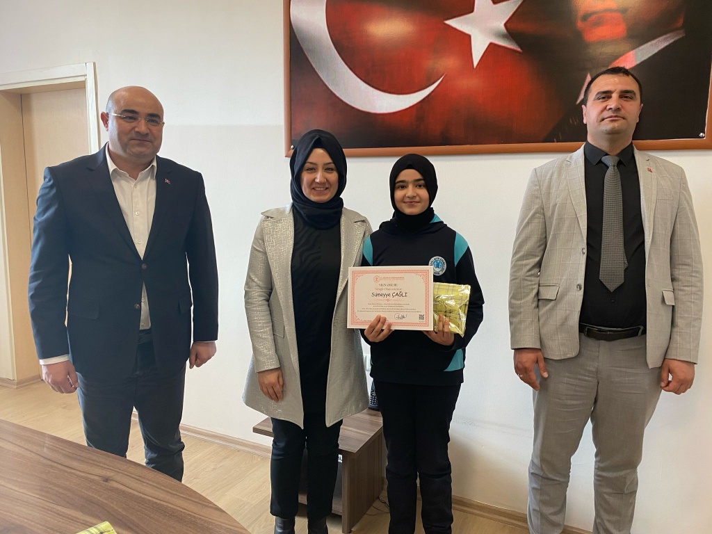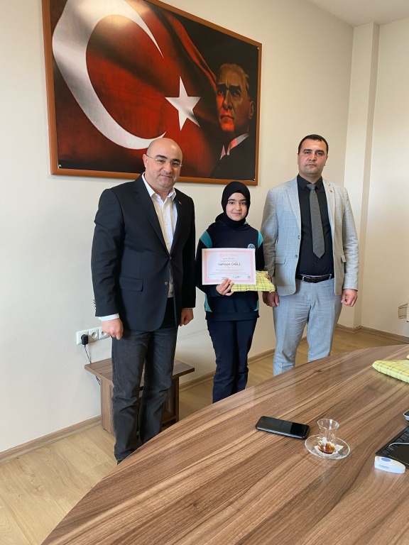 Okulumuz Türkçe öğretmenlerinden Yasemin ZEYTİNOĞLU rehberliğinde 5-C sınıfı öğrencilerimizden Sümeyye ÇAĞLI ile Zeytinoğlu İlçe Halk Kütüphanesi tarafından düzenlenen “Yılın Okuru” törenine katıldılar. Sümeyye ÇAĞLI ilçedeki ortaokullar arasında yılda 78 kitap okuyarak 1.oldu ve “YILIN OKURU” seçildi. Öğrencimize ödülünü İlçe Kaymakamımız Sayın Hayrettin BASKIN verdiler.
